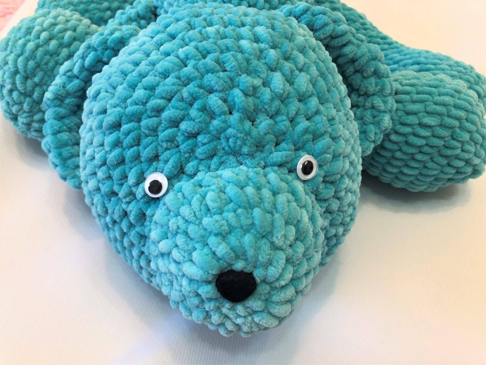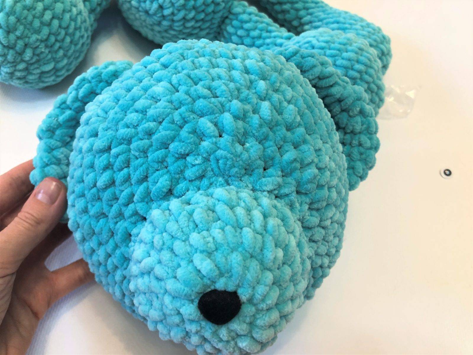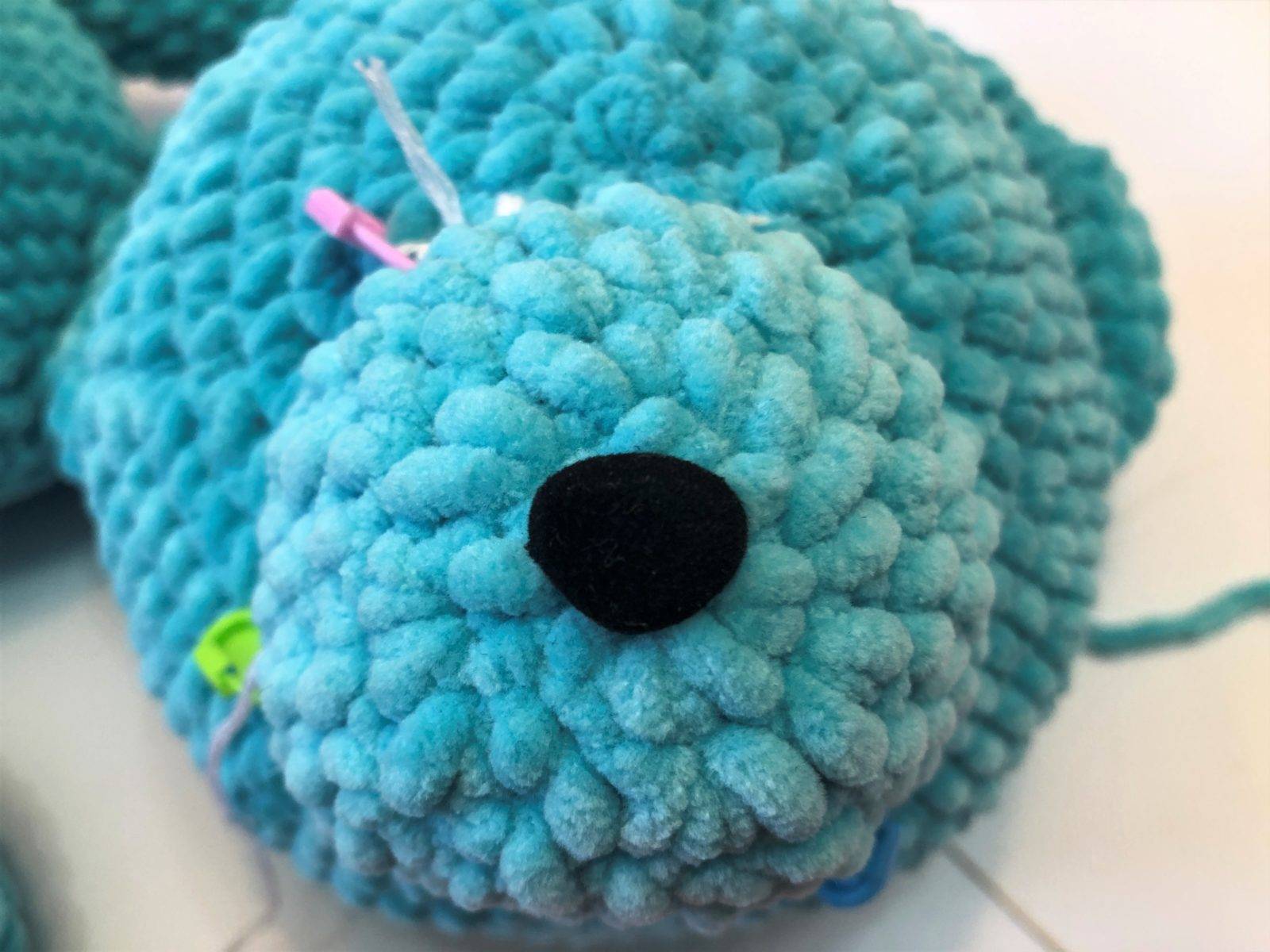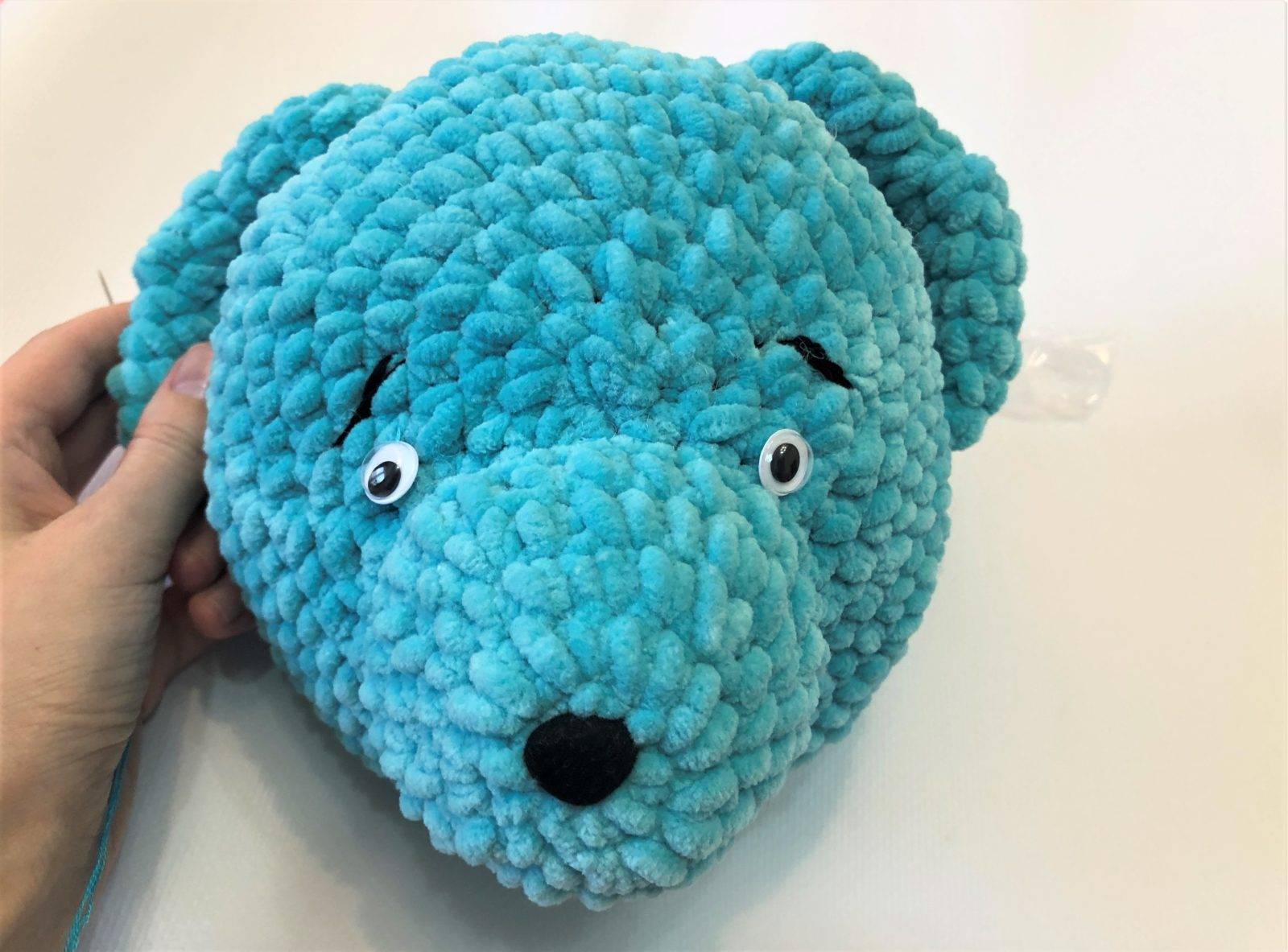 Мордочку вяжем по той же схеме, что и подошву стопы игрушки. В этом случае берем пряжу «ирис» голубого цвета.