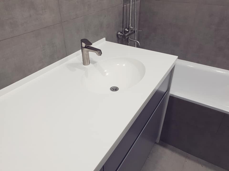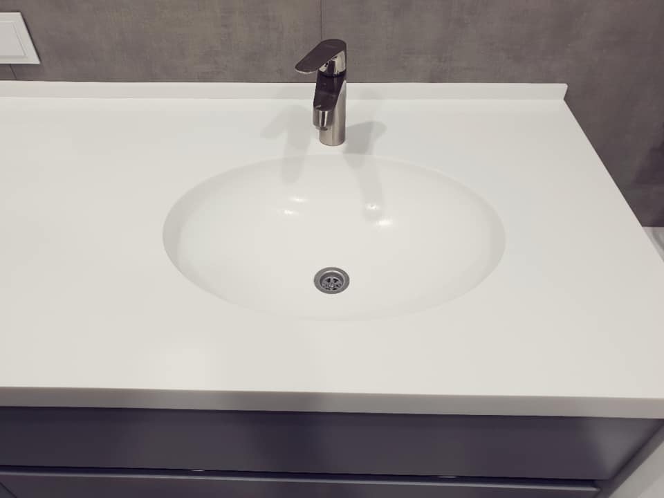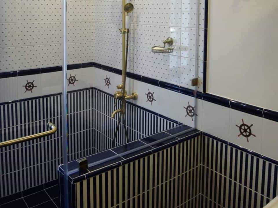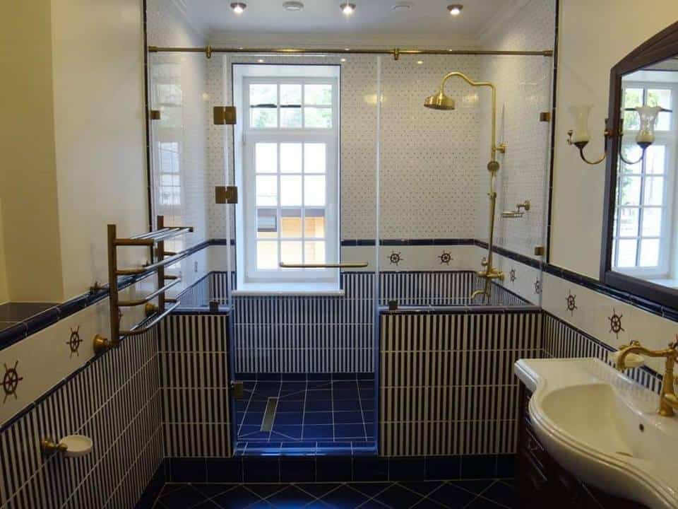 Из перечня материалов исключают полимеры и резину, хромированный металл применяют минимально. Лучше всего ограничиться только смесителем.