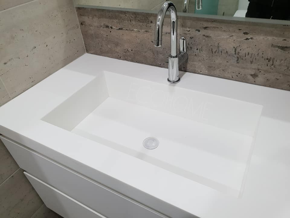 На поверхности имеется небольшая шероховатость, что прекрасно подходит к помещению, выполненному в эко стиле. Прекрасным материалом для отделки стен станет плитка под мрамор или дерево. Комнату в данном интерьере часто может украшать раковина, сделанная из древесины. Пространство, которое имеется под ванной тоже можно прикрыть, воспользовавшись материалом такой же текстуры. Очень красивый вид дает применение столешницы под камень.