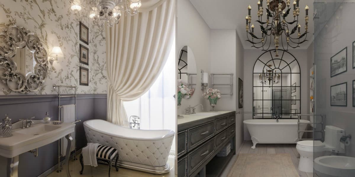 Обязательным элементом, которым должна быть украшена английская ванная комната 2023, является потолочная люстра в соответствующей стилистике.