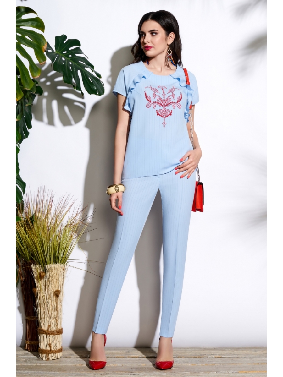 Актуальна модель брючного костюма с джемпером, украшенном баской. Этот элемент декора отличается женственностью, легкостью и воздушностью. Такой костюм прекрасно подойдет и для романтического свидания, и для офиса: при этом следует учитывать его расцветку.