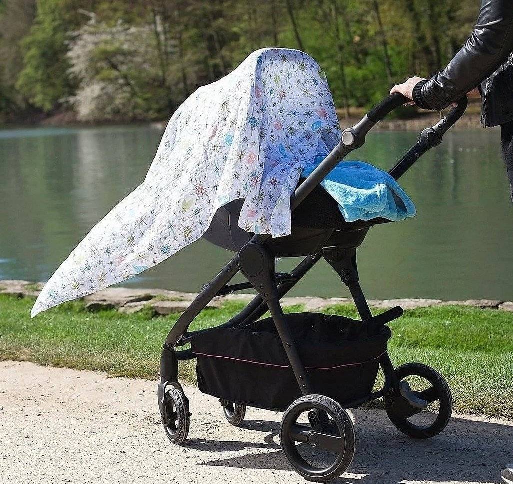 Для использования в качестве навеса муслин подходит намного лучше, чем фланель или ситец. Пеленка будет надежно защищать от солнечных лучей и вместе с тем обеспечит доступ свежего воздуха.