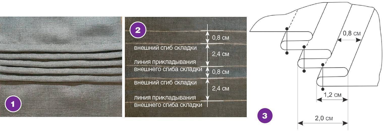 Каждая складка перекрывает другую на 0,4 см (3). Это нужно для того, чтобы не были видны строчки настрачивания.