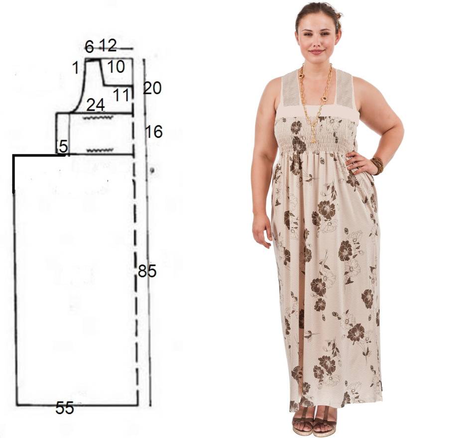 Существуют также модели и посложнее, с оборками, складками и большим количеством швов. А начинающим подойдет выкройка платья, представленного ниже. Летнее платье на кокетке присобрано на груди и пышное на талии. В таком платье не жарко летом. Выкройка достаточно проста и самым сложным элементом будет кокетка. На груди и подоле платья выкройка состоит из прямоугольников.