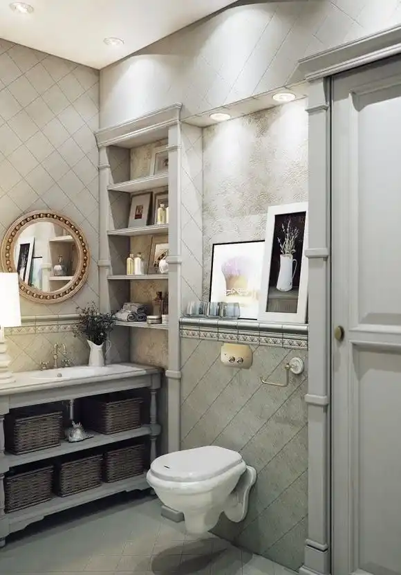 В оформлении туалета уместна сантехника под старину, например, унитаз, оснащённый подвесным бачком, или раковина, дополненная смесителями с вентильными кранами. В качестве акцента подбирают зеркало в ажурной раме или плитку с флористическим принтом, мелкими букетами или луговой травой.