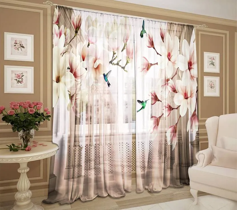 Органза с крупными цветами идеально разбавит классический интерьер Источник cdn1.ozone.ru