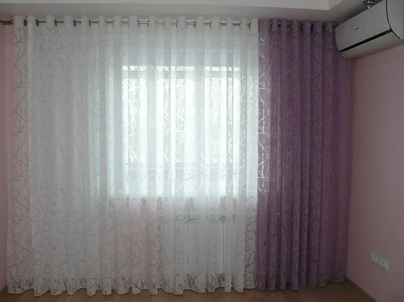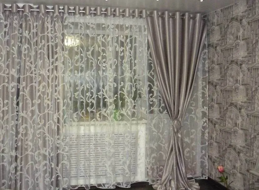Органза на люверсах с ажурным рисунком в ансамбле с атласной шторой Источник sharik-boom.ru