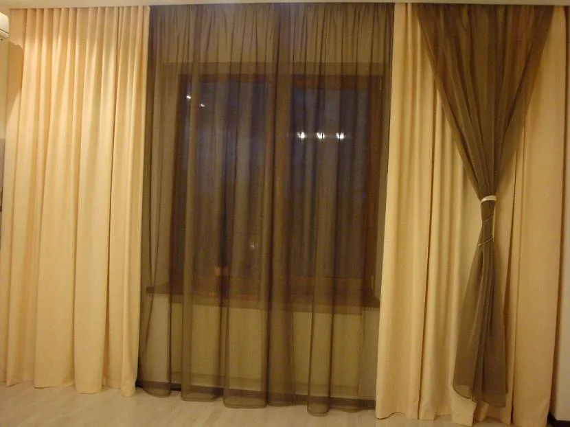 Коричневые занавеси из органзы сочетаются с желтыми шторами из шифона Источник indizajn.ru