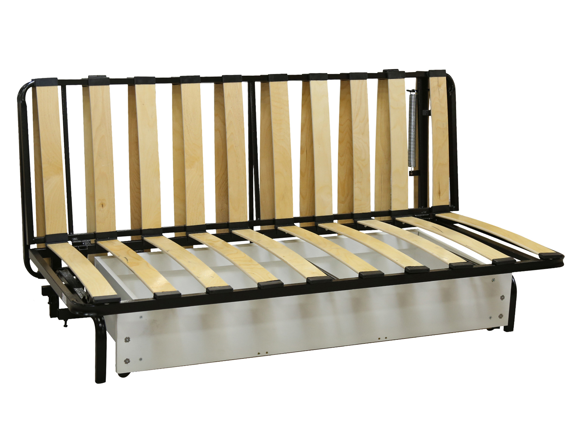 Особенность механизма трансформации «еврокнижки» — практически отсутствие механизма в привычном для нас понимании. Его конструкция — это выездная часть, движущаяся по полозьям, которые могут изготавливаться из металла или массива дерева твердых пород. Есть, правда, варианты и с пластмассовыми направляющими, но по своему качеству и надежности они сильно уступают указанным выше вариантам. Вторая подвижная часть — это спинка, которая закреплена на подвижной основе, благодаря корой она свободно поднимается/опускается.