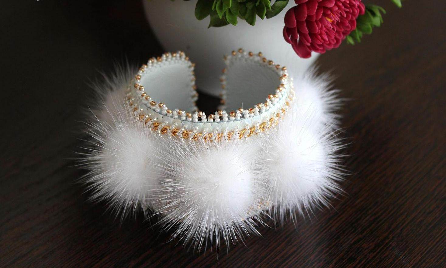 Чтобы сделать браслет из меха норки, потребуются такие материалы, как меховая полоса нужной длины, цепочка такого же размера, красивые пуговицы для декора. Цепочка пришивается с лицевой стороны меховой полоски горизонтально по центру. Сверху, прикрывая цепочку, нашиваются пуговицы. К концам цепочки крепится застёжка.