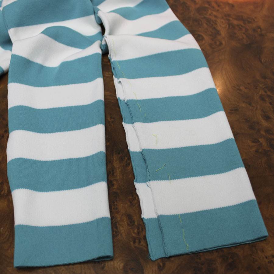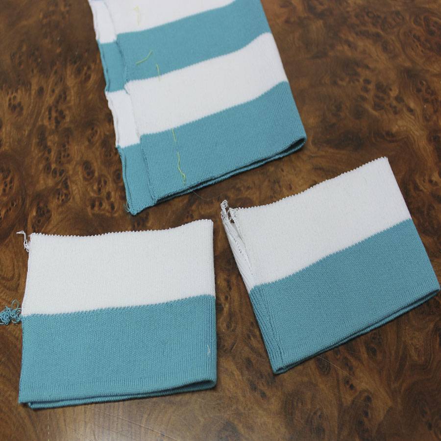 Нарезать из трикотажного полотна поперечные полосы шириной 2,5 см. Длина нарезанных деталей зависит от модельных особенностей. Желательно вырезать полосы с запасом по длине, так как возможна усадка трикотажа в процессе обработки, и в дальнейшем по концам полосы нужно будет срезать примерно 2,0-3,0 см.