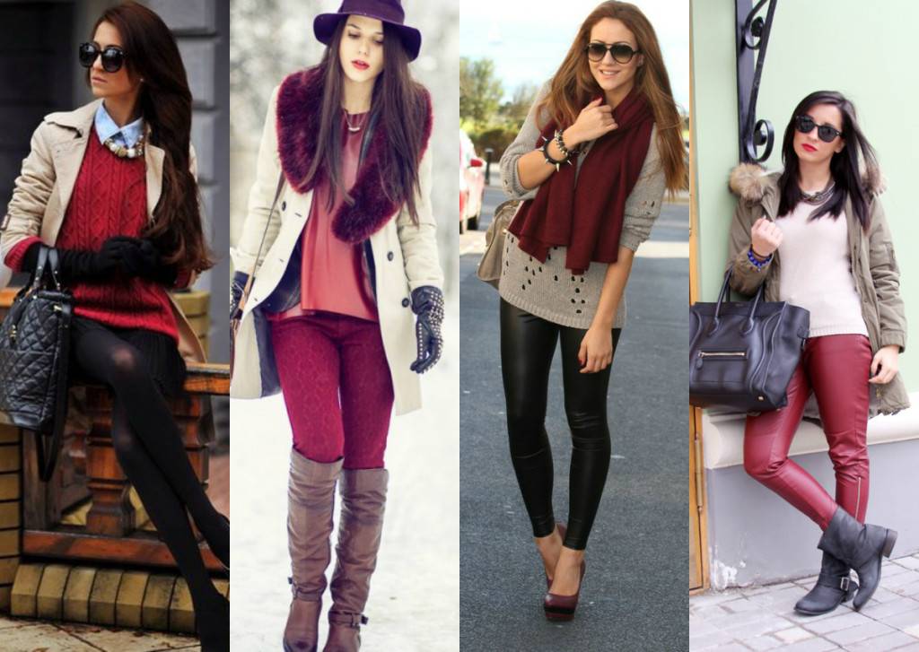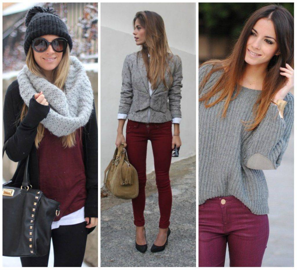 Оригинальное сочетание бордового цвета в одежде получается со светло-серым и оттенками белого