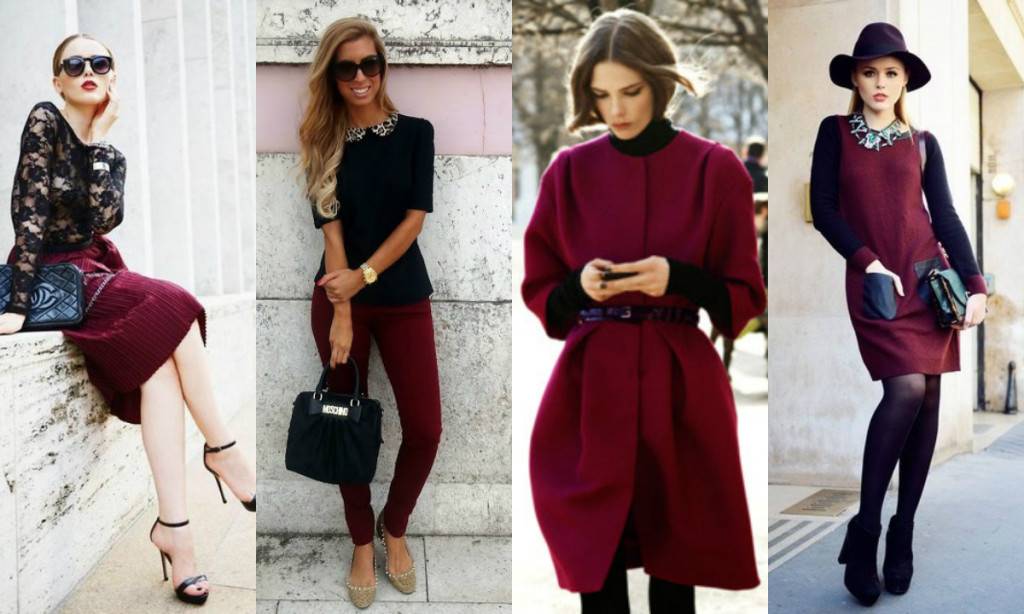 Чтобы сохранить эффектность и немного «разбавить» винный лук, к нему стоит приобрести качественные вещи черного, белого и серого цвета. Если такое классическое решение покажется моднице скучным, она может смело экспериментировать и добавлять в лук одежду пастельного, молочного или кофейного цвета.