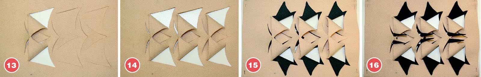 Шаблоны накладываются на слои материала, и переносятся линии надрезов. На деталях обязательно помечаются центральные линии, они совмещаются при наложении слоев друг на друга, что позволяет избежать смещения рисунков верхнего и нижнего слоев. По намеченным линиям на каждом слое выполняются разрезы (12 а, б). Оставшиеся линии намелки удаляются, детали приутюживаются.