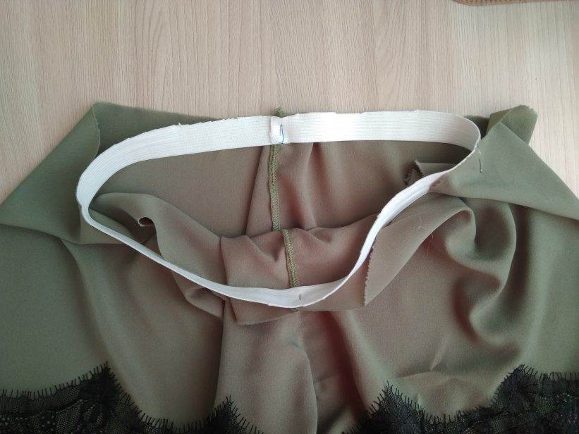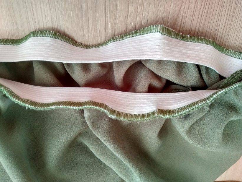 22. Перегибаю резинку на изнаночную сторону. Пришиваю к шортам на машинке обычной прямой строчкой.