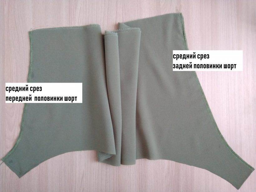 12. Теперь приступаю к пошиву шорт. Для этого накладываю две детали лицевыми сторонами внутрь и соединяю на машинке по средним срезам, затем обметываю.