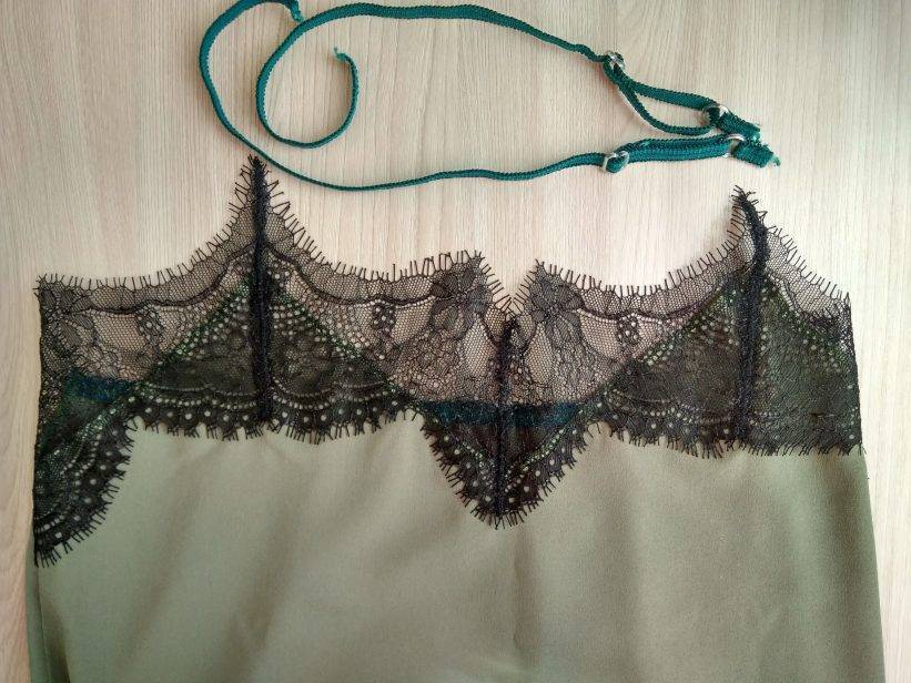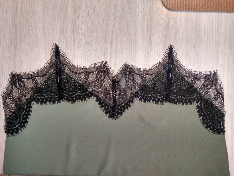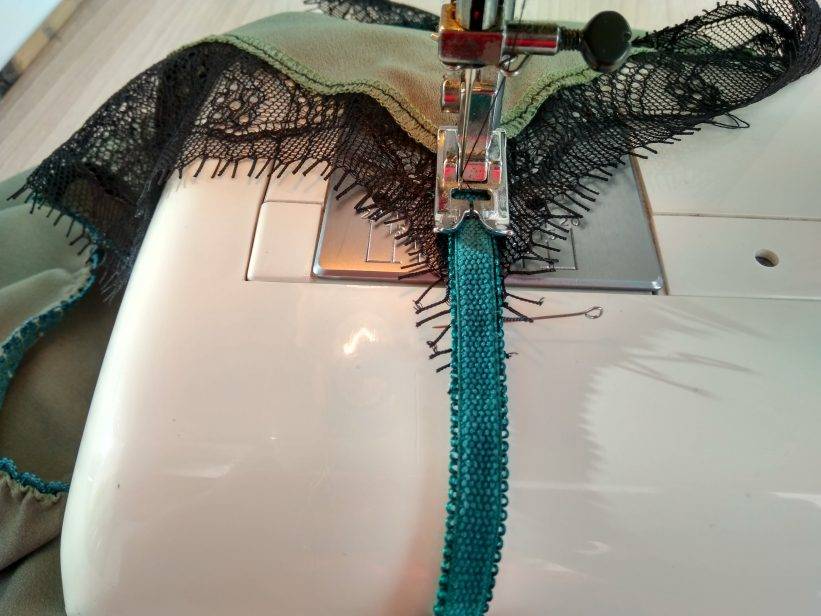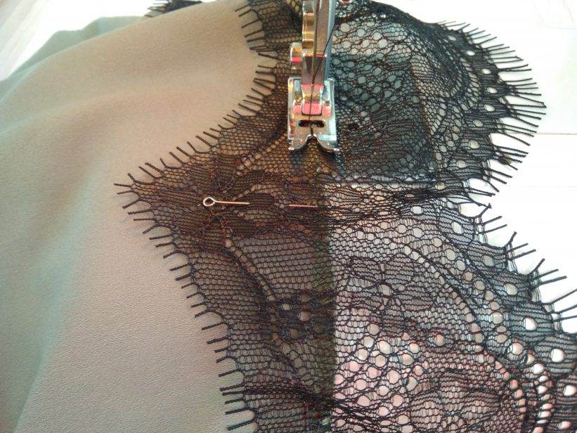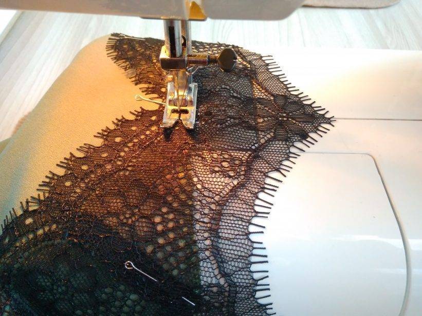 4. Затем пришиваю кружево к ткани верха на швейной машинке прямой строчкой.