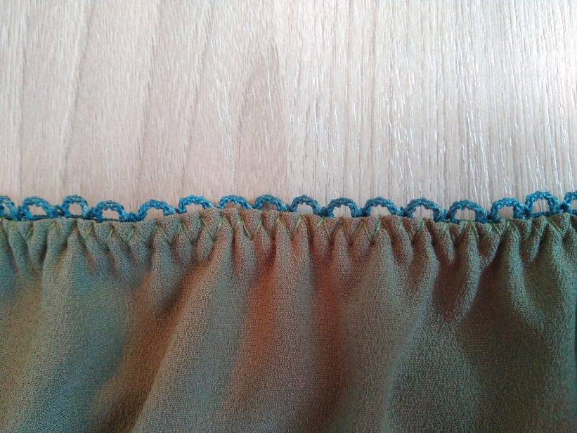 1. Обметываю на оверлоке верхний край переда (полочки) топа. Если у вас нет оверлока, вы можете сделать тоже самое применив строчку зигзаг на швейной машинке.