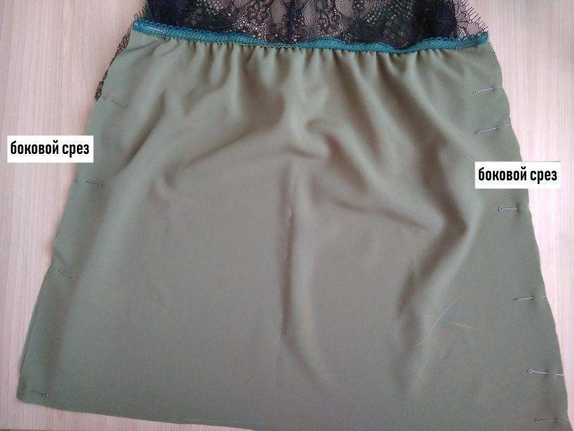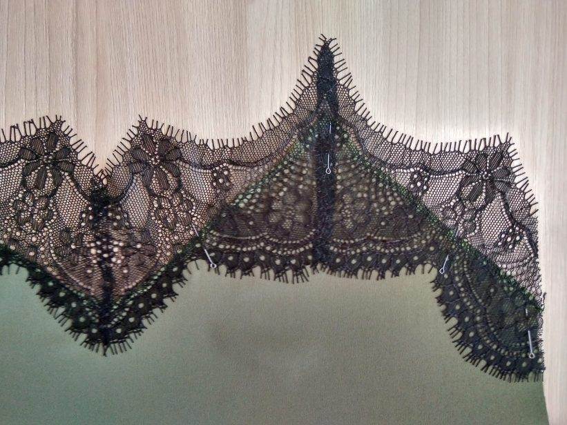 17. Прикрепляю кружево к штанине портновскими булавками так, чтобы шов на кружеве остался внутри, там где находится шаговый срез.