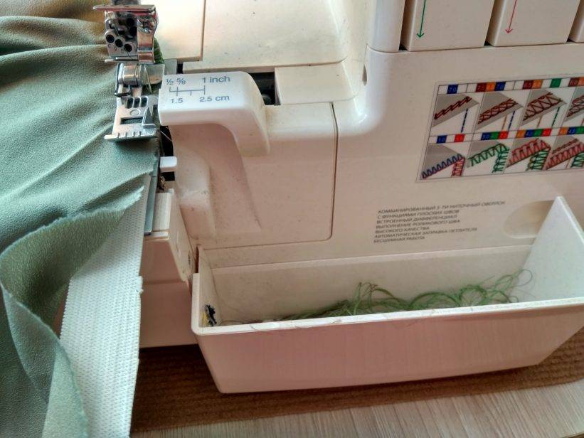 21. Пришиваю по лицевой стороне на оверлоке резинку к шортам, равномерно натягивая её между булавками.