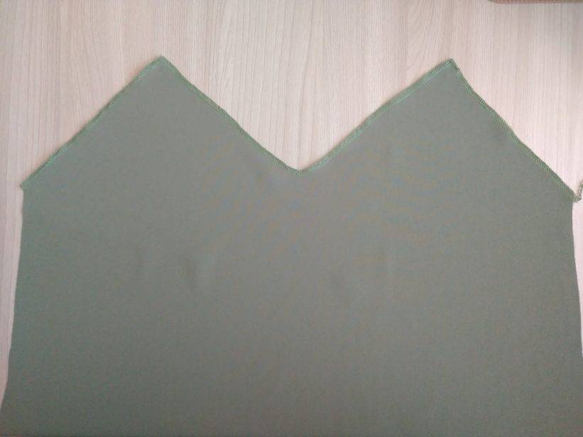 Полоску, предназначенную для горловины, сложите пополам и пришейте к срезу горловины, по аналогии с ранее пришитыми полосками ткани.