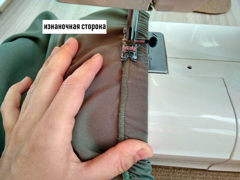 6. Натягиваю резинку равномерно от одного края к другому, пришиваю на машинке строчкой зигзаг.