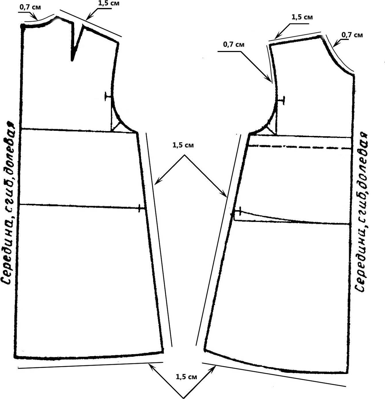 - Для того чтобы расклешить внизу, по боковым срезам, делаются прибавки до 15 см;