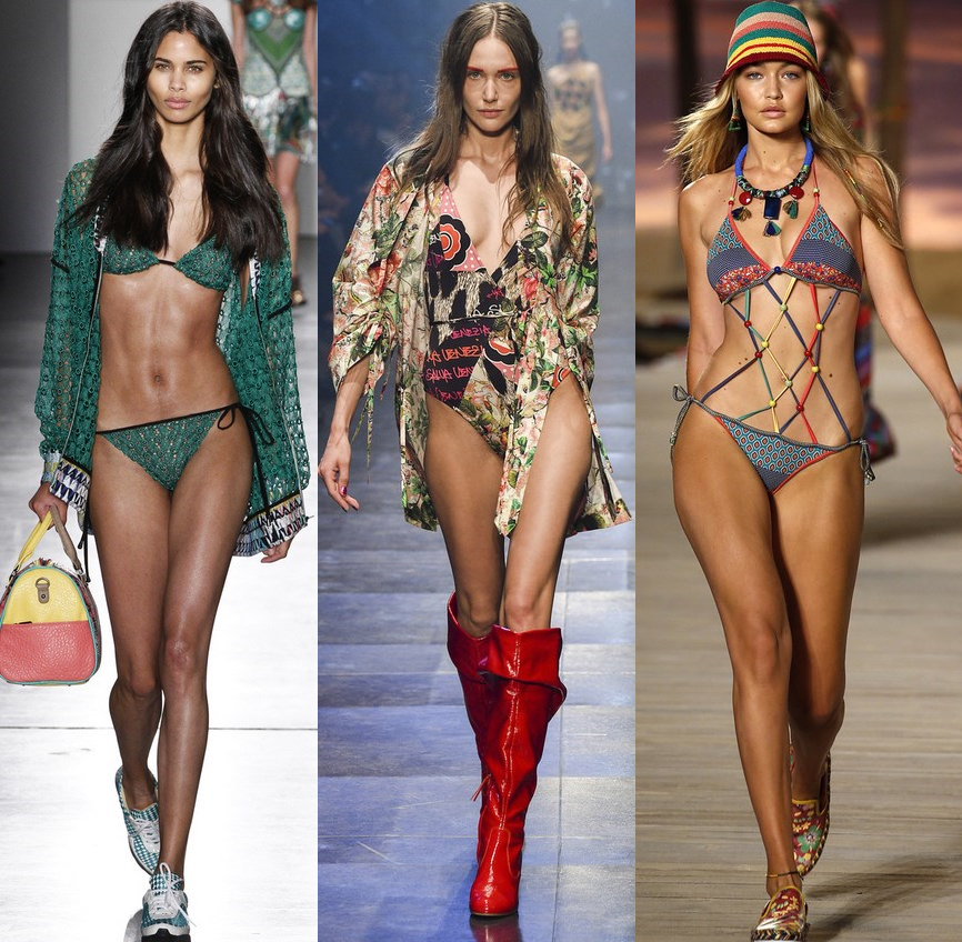 - девочки — дизайнеры предлагают пестрые закрытые купальники из натуральной ткани с вкраплениями эластана, с добавлением бусин и страз. Раздельные купальные костюмы представлены красивым лифом, обрамленным бахромой, а также трусиками на завязках;