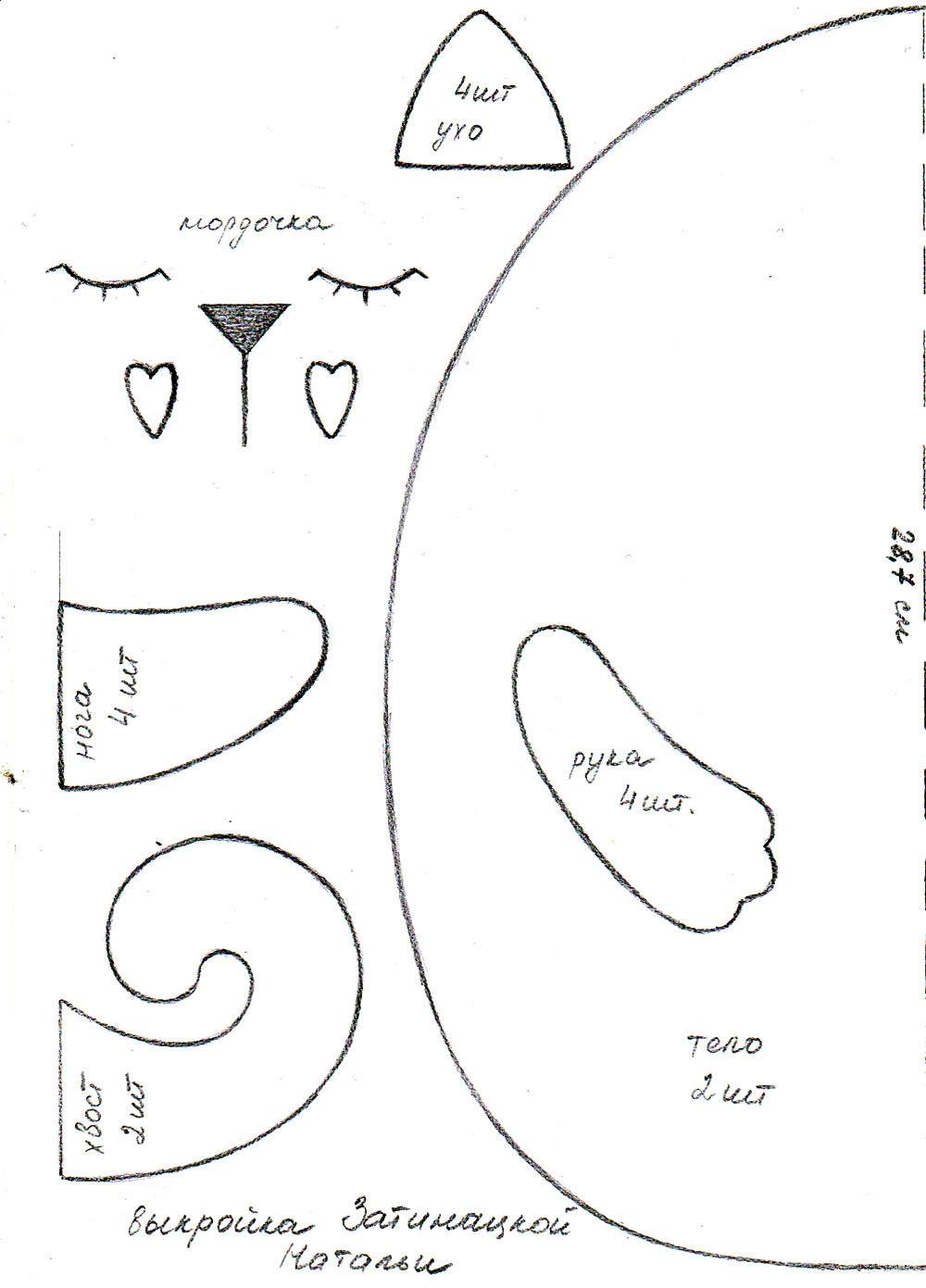 Первым делом распечатайте на бумаге или перерисуйте вручную выкройку котенка (кликните на картинку, чтобы она увеличилась и скачивайте). Вырежьте все элементы.