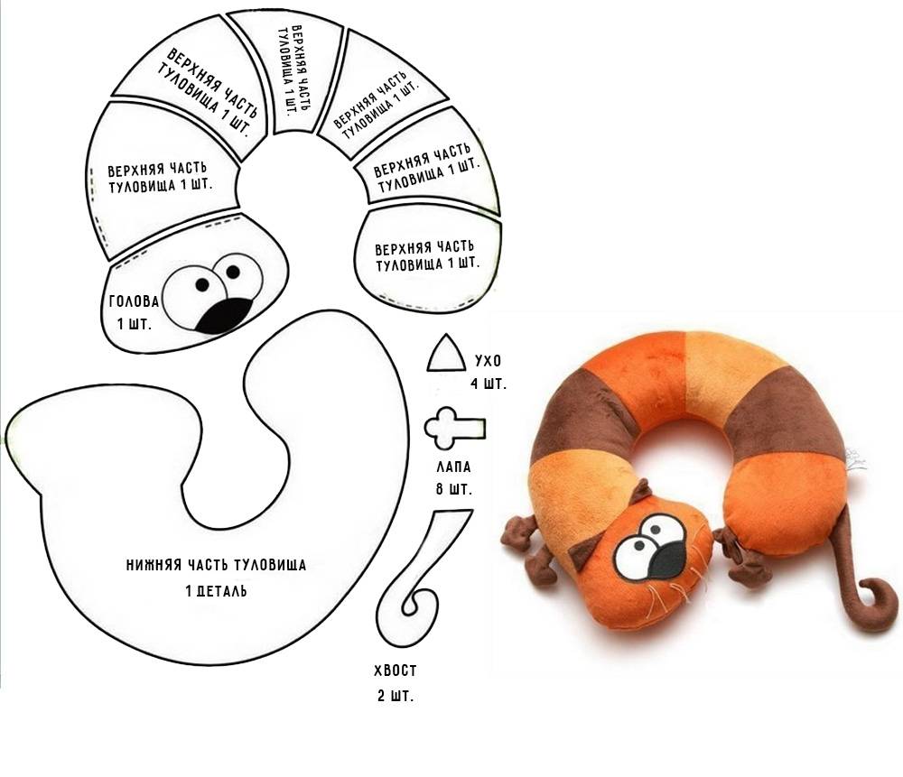 , в которые после сна укладывается пижама ребёнка. Это приучает малыша к аккуратности и порядку. К выкройке подушки любой формы добавляется карман на молнии или пуговице. И получаем игрушку с практическим применением. По размеру такая подушка не может быть крохотной. - Для отдыха во время автопутешествий