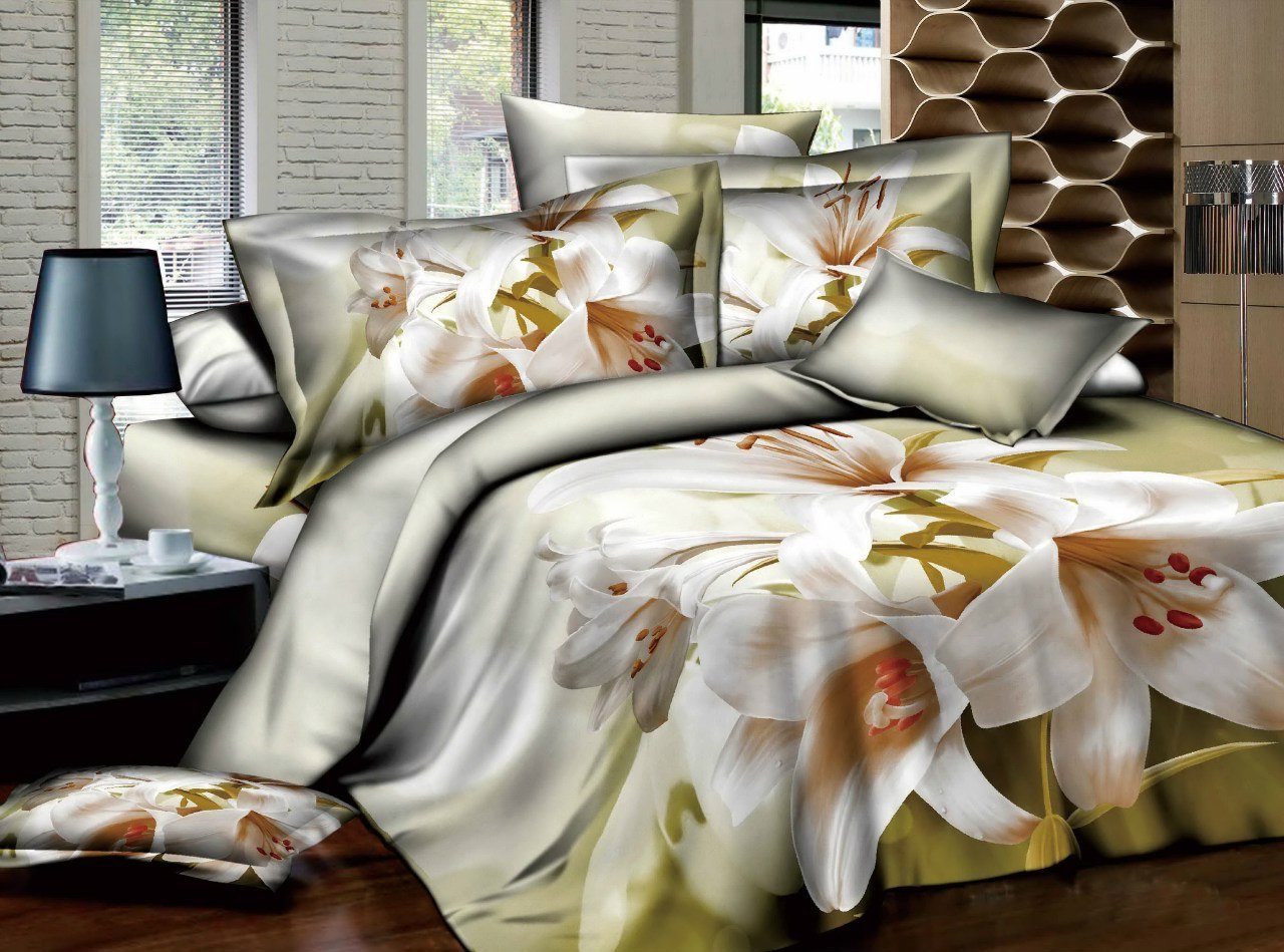 3D-изображения встречаются сейчас практически везде, декорируя одежду, сумочки и интерьеры. Нашлось им место и в спальне. Такой рисунок наносят методом фотопечати, поэтому итоговая картинка выглядит невероятно эффектно. Технологический тренд порождает естественные принты с оригинальными завораживающими сюжетами. Благодаря тому, что узор получается «живым», в спросе трехмерные пейзажи, цветы и животные.