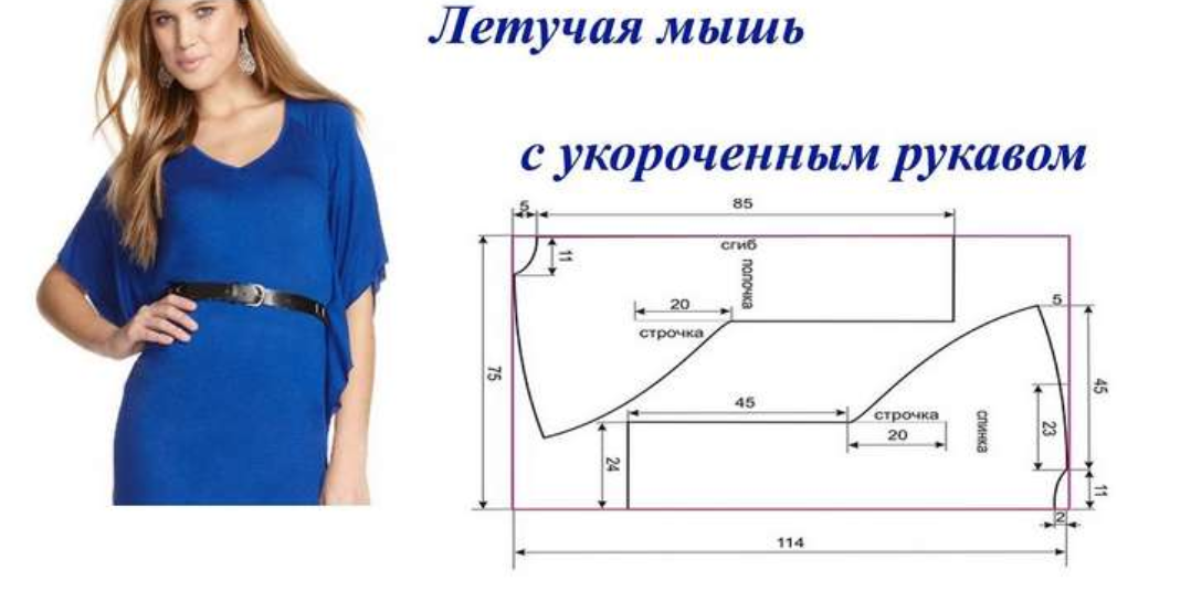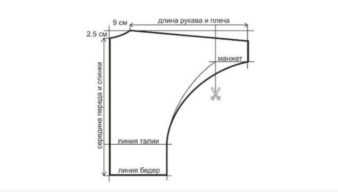 - Изогнутой линией соединить низ изделия и конец рукава (получится фасон «летучая мышь»).