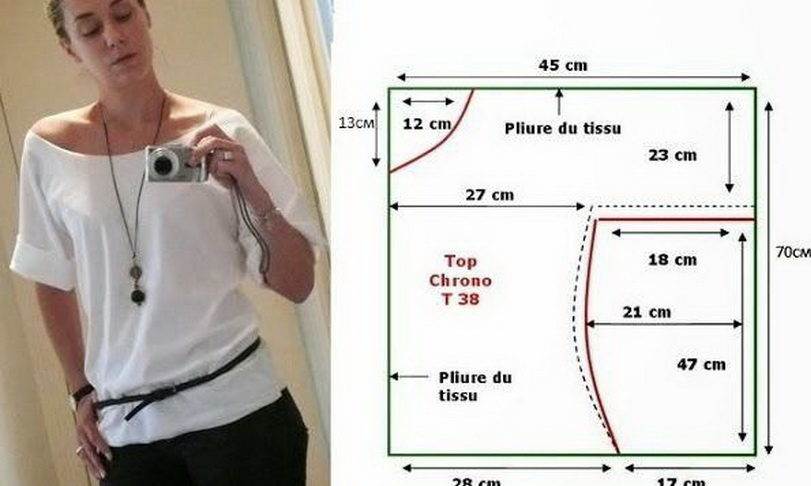 Можно поступить еще проще — переснять выкройку со своей любимой футболки — сложить пополам, обвести на ткани сложенной в сгиб, также переснять рукава.