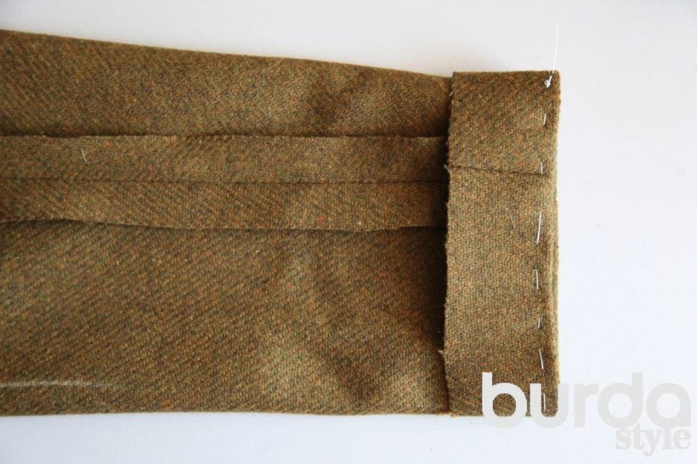 Рукав приметать, начиная от верха рукава, делая при этом припосадку рукава. Припуск подвернуть и сметать у края рукава.