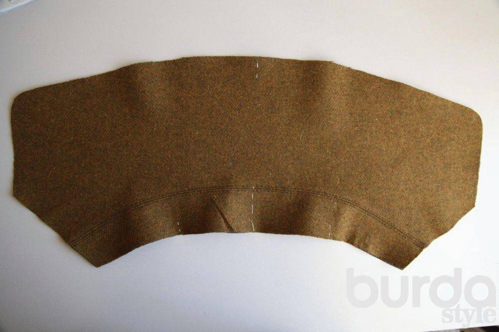 Обрабатываем горловину: для этого используем обтачку, выкроенную по форме горловины (ширина обтачки 5 – 7см). Для начала обтачку сшиваем по плечевым срезам и разутюживаем припуски, внутренние срезы обтачки обметываем или обрабатываем швом в подгибку. Далее обтачку накладываем на лицевую сторону нашего пальто лицевой стороной вниз, уравниваем врезы, совмещаем швы стачивания обтачки с плечевыми швами изделия и обтачиваем срез горловины