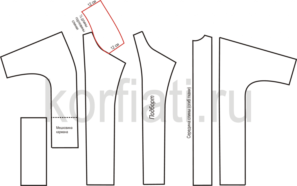 - Боковая часть полочки, цельнокроеная с рукавом и мешковиной кармана — 2 детали