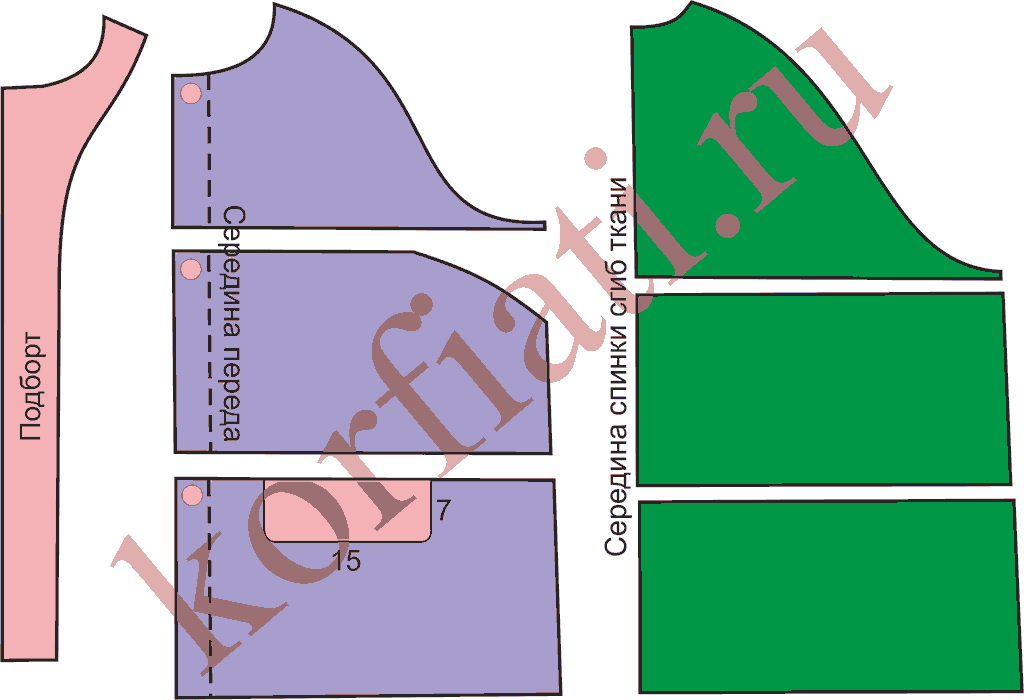 Подборта, верхние детали клапанов и подкройную обтачку спинки укрепить термотканью