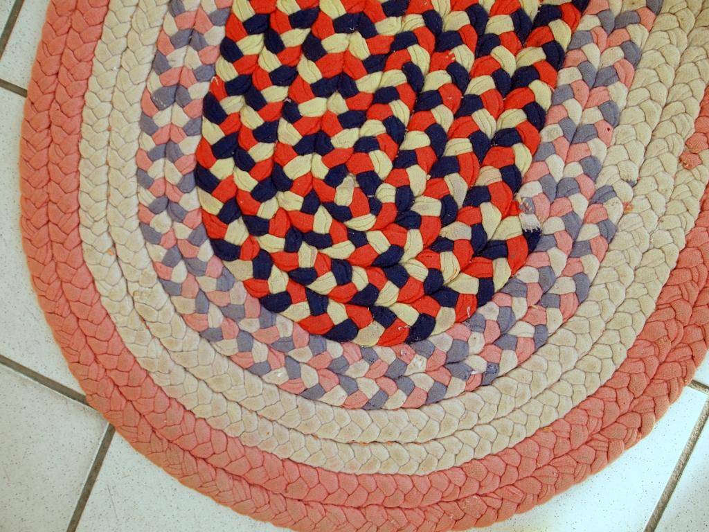 - Сшитое из косичек из ткани. Используют старые вещи, порезанные на длинные узкие полосы, либо ленточную пряжу. Из ленты плетут косички нужной длины, затем сшивают их между собой.