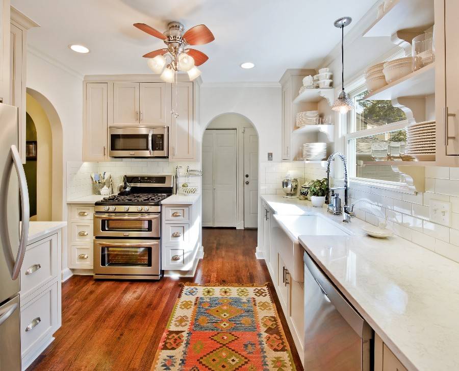 в классических кухнях можно постелить однотонные ковры светлых или темных тонов с минимальным орнаментом либо без него, ориентируясь на остальную отделку.