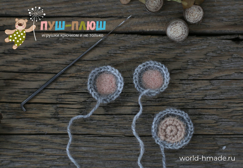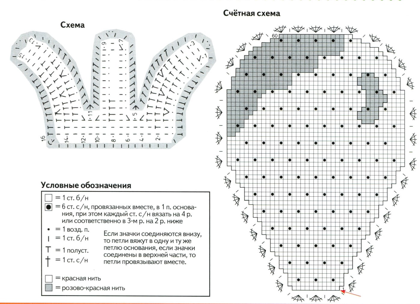Ушки сделать по сх. Начать розовым цветом, жирная точка – первая в. п. Набрать 6 в. п., 1-ю т. п. связать во 2-й в. п. с крючка. После 7-го р. боковые кромки и нижнюю кромку тонкой линии обвязать. Начать вязать серым от стрелки и сделать еще 3 р.