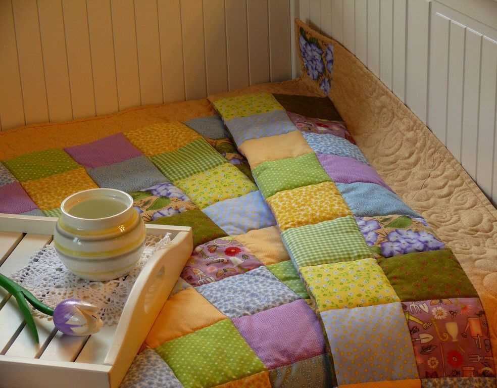 Одеяло, сшитое самостоятельно в технике пэчворк, создает по-домашнему комфортную и уютную обстановку.