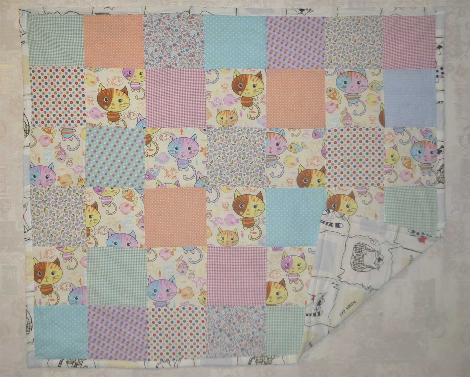 Подготовленные материалы укладываем в виде слоенного пирога, а именно: сначала яркую ткань, затем синтепон и в самом конце однотонную ткань. Края ткани подгибаем во внутрь и прошиваем на швейной машинке. Готовое одеяло простегиваем в виде ромбиков или квадратов, это придаст ему дополнительную прочность. Такое одеяло по красоте и качеству не уступит магазинному и будет радовать своего обладателя многие годы.