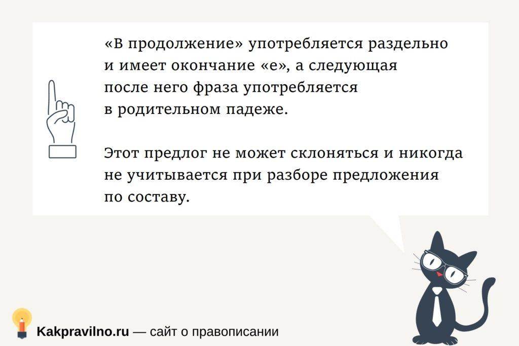 Помните! «В продолжении» можно встретить в винительном падеже. В этом контексте словосочетание будет оканчиваться на «е». Например, автор добавил в продолжение книги новую важную информацию.