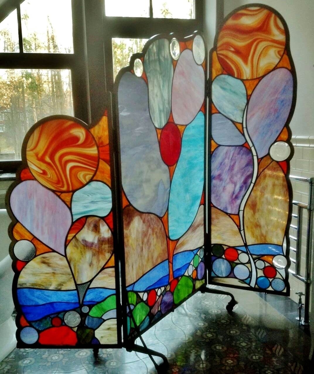 Можно украсить интерьер великолепным дизайнерским изделием из художественной ковки или конструкции с витражами в виде мозаики, оно придаст помещению индивидуальность и неповторимость. В комнате при помощи раздвижных декоративных перегородок для зонирования пространства можно обустроить комфортный уголок, например, для приёма гостей или отгородить кровать в квартире-студии.