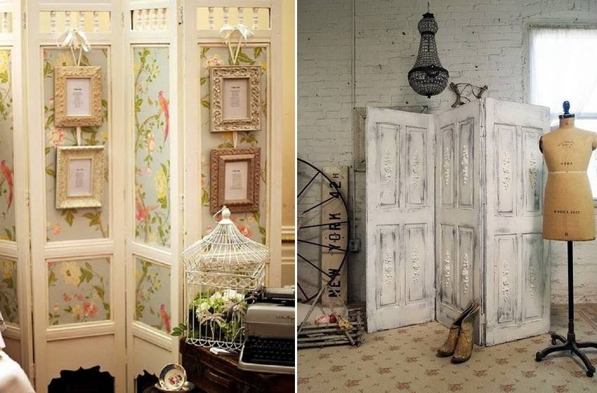 Перегородки для комнаты в стиле шебби-шик – это намеренная имитация старения материалов. Если используется дерево, то производитель обрабатывает его наждачной бумагой, создавая потертости, после чего покрывает лаком. Подобный дизайн используется и для текстиля: для ширмы изготовители берут простые ткани с незамысловатым рисунком: