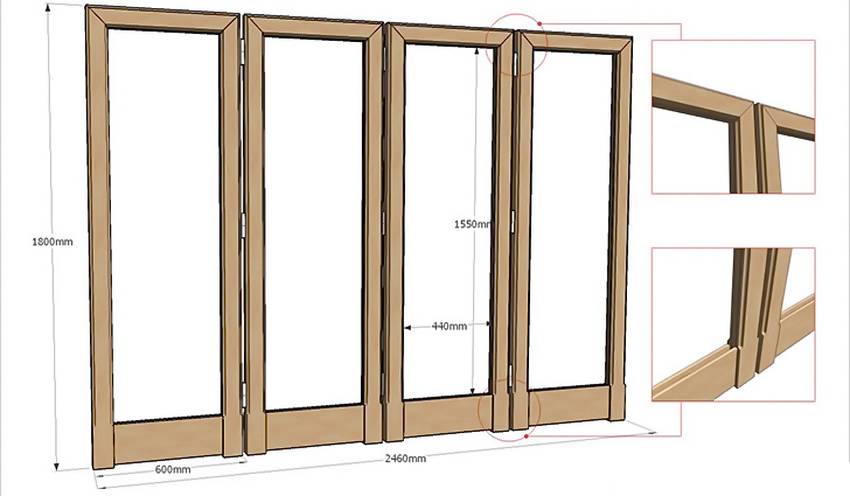 Работу начинают со сборки рам каркаса. Бруски необходимо подогнать по размерам створки и соединить в рамы. При скреплении брусков следует пользоваться угольником, чтобы соблюсти прямой угол и не допустить перекоса створок. Между собой элементы рамы соединяют посредством саморезов или гвоздей. Готовые конструкции покрывают лаком и оставляют до полного высыхания покрытия.