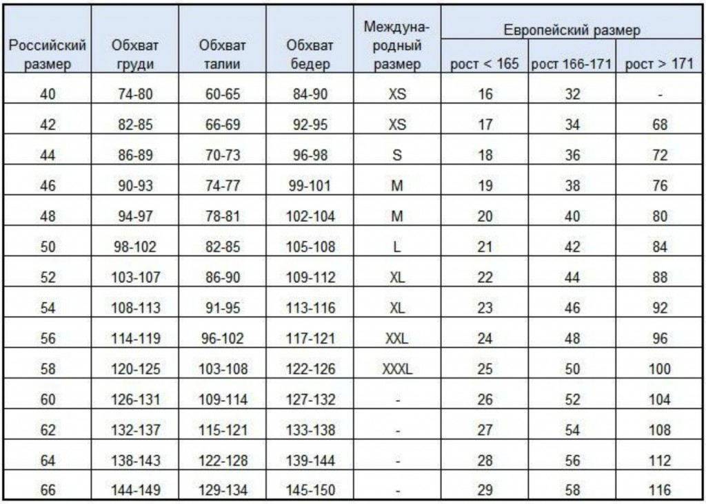 Буквенные значения(S, M, L и так далее) обозначают международный размер. В соседней колонке все международные размеры переведены в российские, обозначающиеся цифрами.