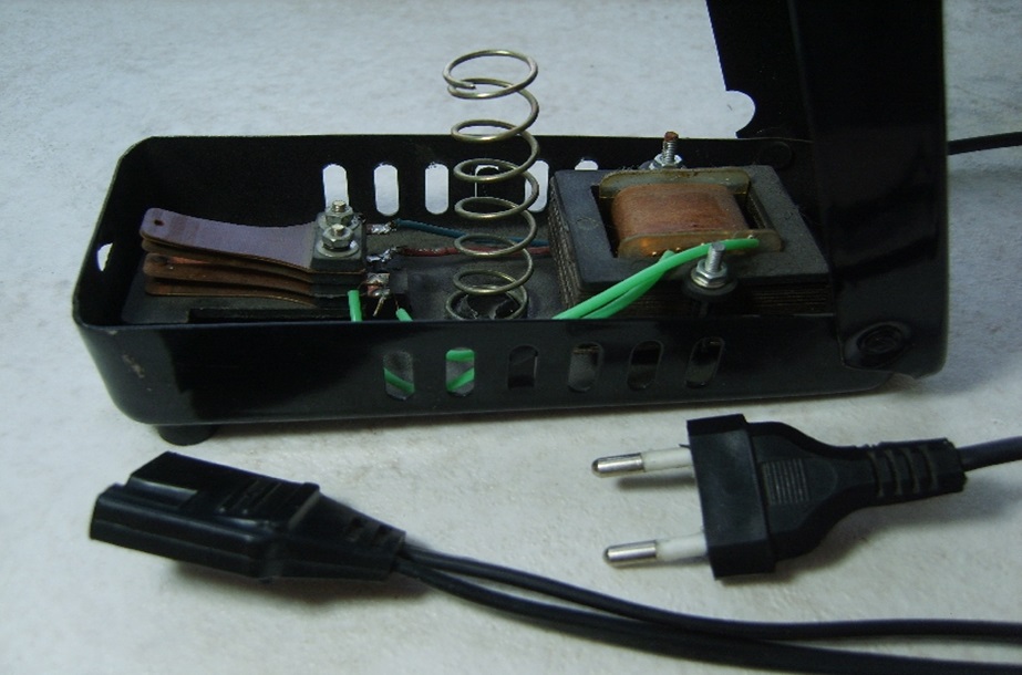 3. В электродвигатель швейной машины не поступает ток. Разорвана цепь от розетки до двигателя из-за окисления медных крайних шайбочек в угольных столбиках реостата швейной педали.
