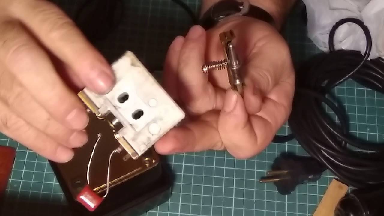 3. В электродвигатель швейной машины не поступает ток. Разорвана цепь от розетки до двигателя из-за окисления медных крайних шайбочек в угольных столбиках реостата швейной педали.