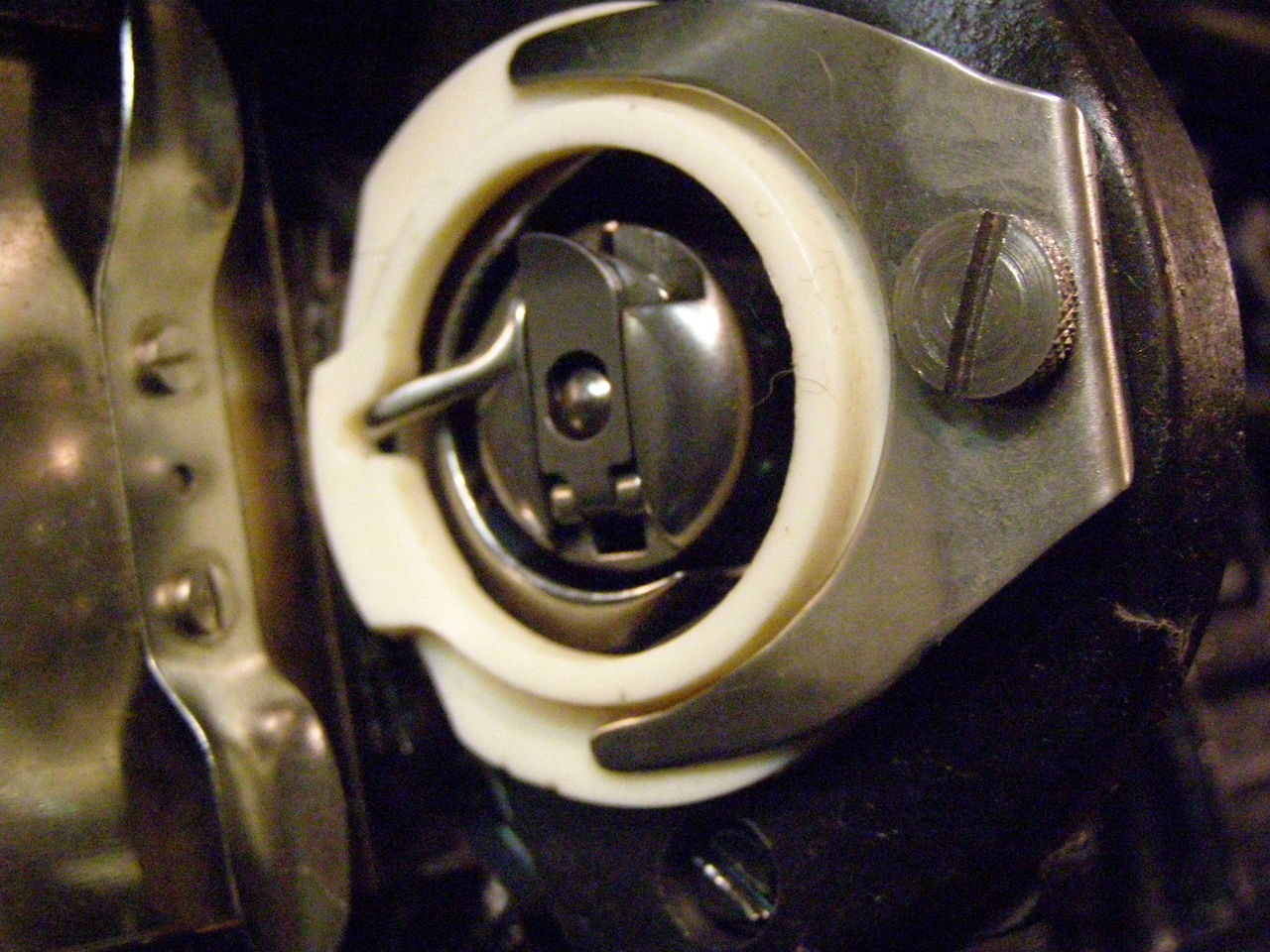 Как только игла поднимается на 2 мм, формируется петля из верхней нити. В это время носик челнока должен проходить вплотную от ложбинки иголки